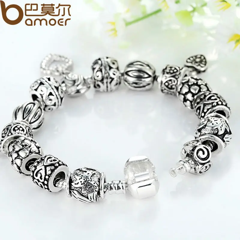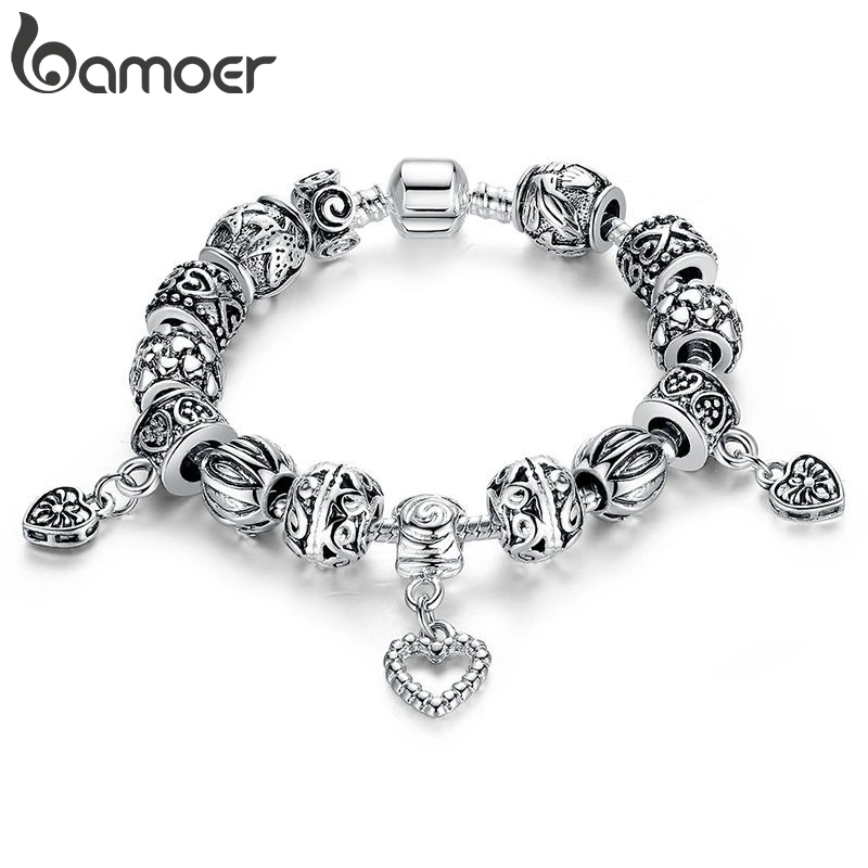 Best BAMOER Antique Silver Charm Bracelet & Bangle Silver 925 With Heart Pendant for Women Wedding Vinta